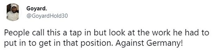 'People call this a tap in but look at the work he had to put in to get in that position. Against Germany!' one fan on Twitter said.