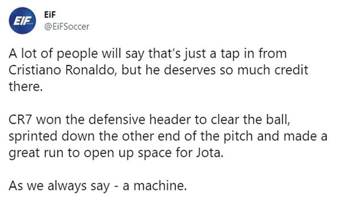 'CR7 won the defensive header to clear the ball, sprinted down the other end of the pitch and made a great run to open up space for Jota. As we always say - a machine.'
