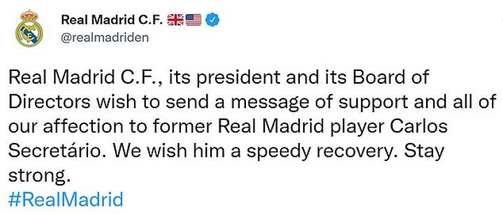 'Real Madrid C.F., its president and its Board of Directors wish to send a message of support and all of our affection to former Real Madrid player Carlos Secretário. We wish him a speedy recovery. Stay strong,' the club wrote.
