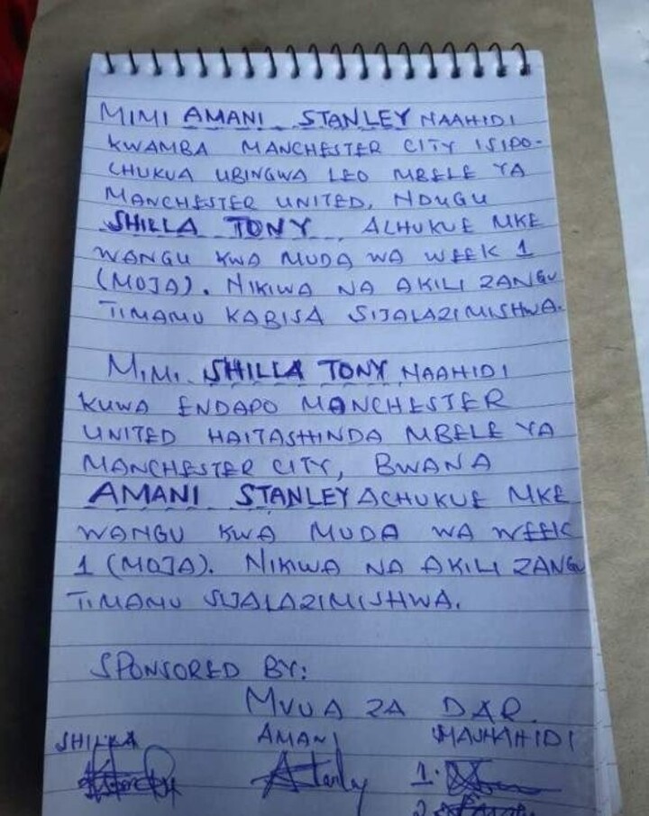 A hand written agreement between the two Tanzanian gentlemen has been widely shared on social media with each of them pledging to give up his wife to the other for a week in the event of a loss for either Manchester City or Manchester United.