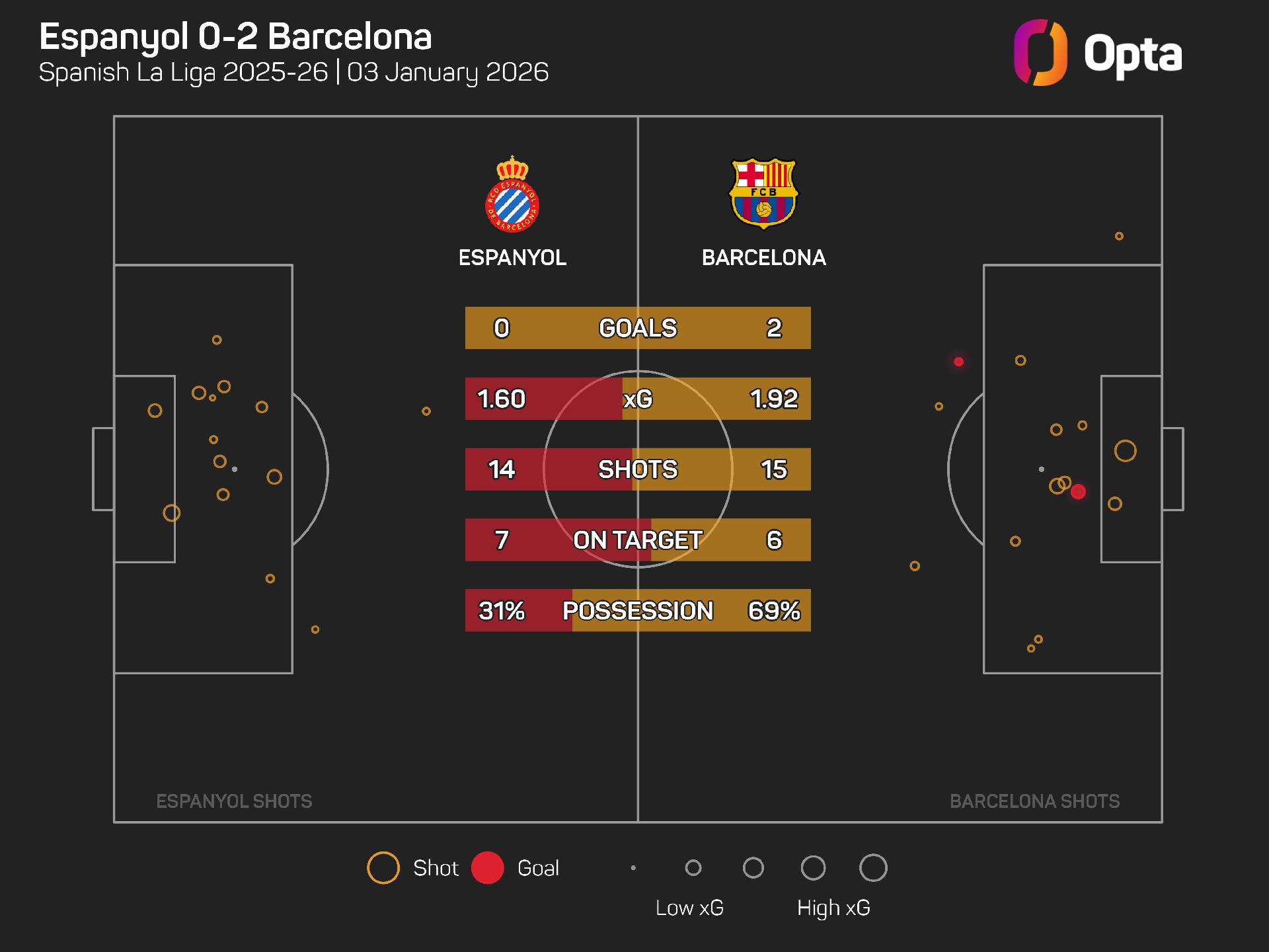 But Flick's side were made to work hard for the win, with Espanyol having 14 shots to Barca's 15, while the hosts had one more effort on target than them (seven to six).