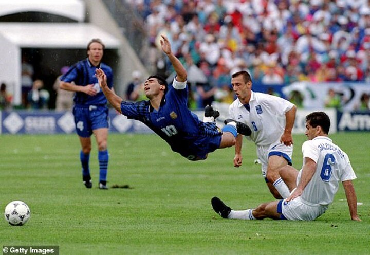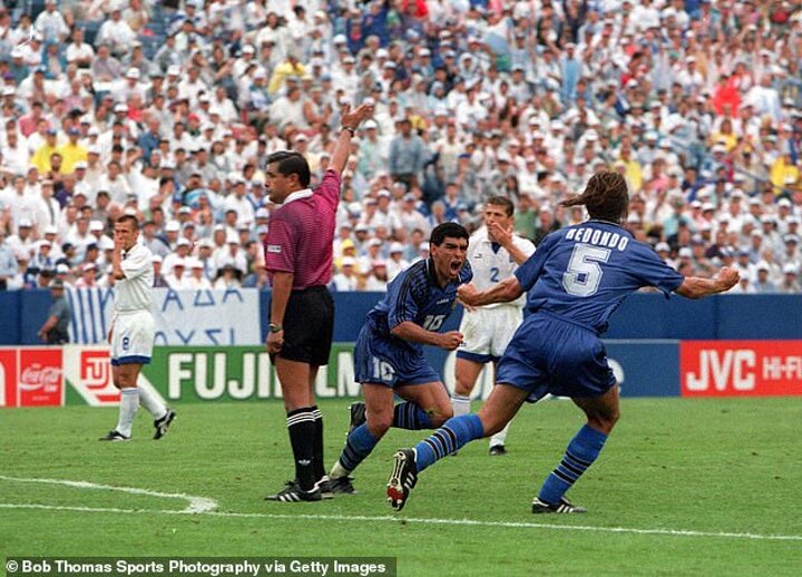 That man, of course, is Diego Maradona, and that goal was against Greece on June 21, 1994 in Argentina's opening match of the World Cup in Foxborough, Massachusetts. It wasn't the goal, however, that would go down in history but the celebration. Continuing the momentum from his strike, Maradona ran towards the nearest camera, eyes bulging as he screamed in a state somewhere between joy and anger.