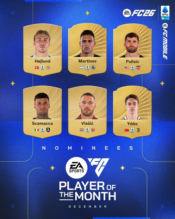 As a final wrapup of the year 2025, Serie A official recently opened the poll for voting the Player of the Month for December. Among Hojlund, Martine, Pulisic, Scamacca, Vlasic and Yildiz, who do you think the most competitive player of the month?