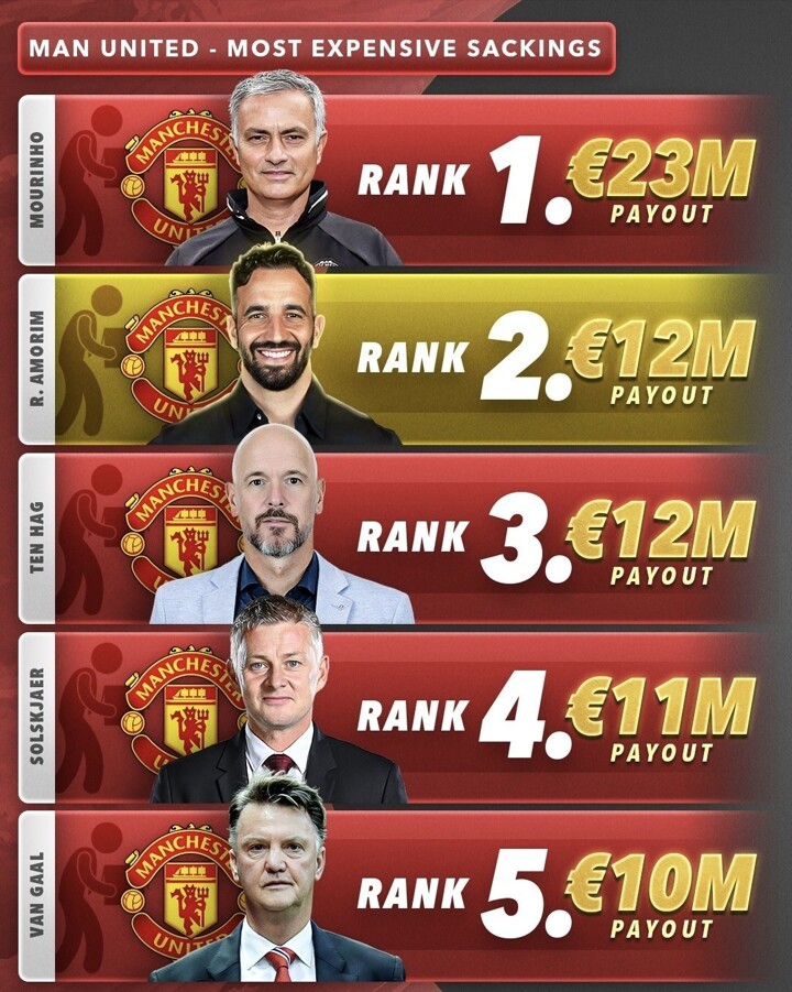 Recently, Score90 published a ranking of severance payments Manchester United has paid to sacked managers. José Mourinho leads the list with a €23 million payout, while Ruben Amorim and Erik ten Hag are tied next at €12 million each.