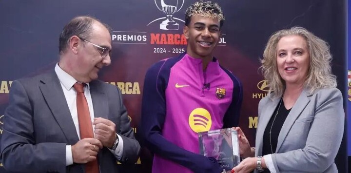Lamine Yamal received the Di Stéfano Award for best player of the season from the director of MARCA.