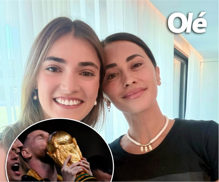 A photo shared by Olé shows Messi's wife, Antonela, posing with friends while wearing a T-shirt featuring a picture of Messi kissing the World Cup trophy.