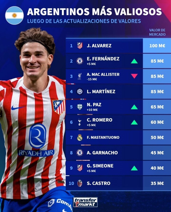 On December 27, Transfermarkt listed the 10 most valuable Argentine players. Julián Álvarez topped the list with a value of €100 million, while Enzo Fernández, Mac Allister, and Lautaro Martínez were tied for second place with €85 million each.