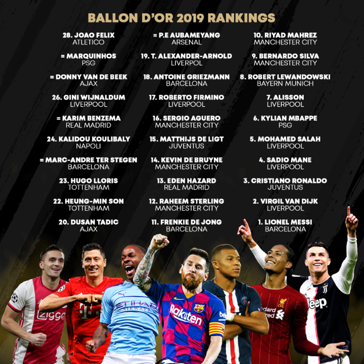 Ballon d'Or breakdown: Messi the winner, Van Dijk 2nd, Ronaldo 3rd and Mane 4th