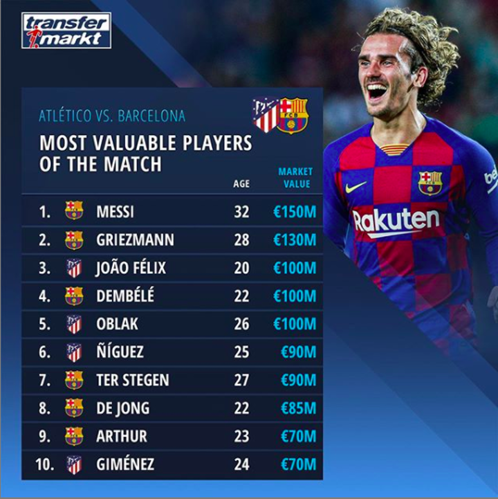 Messi leads the ranking of most valuable players of the match as his market value is €150m, Griezmann follows and Atletico's highest market value player Felix is 3rd.
