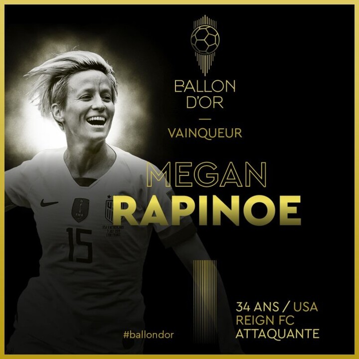 USWNT's World Cup heroine Megan Rapinoe has been named 2019 Women's Ballon d'Or winner.