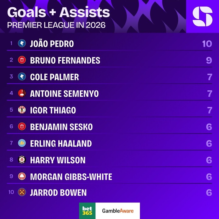 According to football statistics website Squawka, Joao Pedro the Chelsea winger has scored+assisted 10 times since 2026, becoming the most in the Premier League.