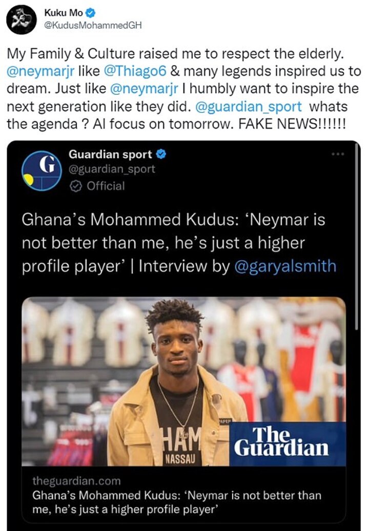 Ghana's Mohammed Kudus described a story about a feud between himself and Brazil icon Neymar as fake news, despite making a bold claim about the PSG star, before taking a dig at the his age.