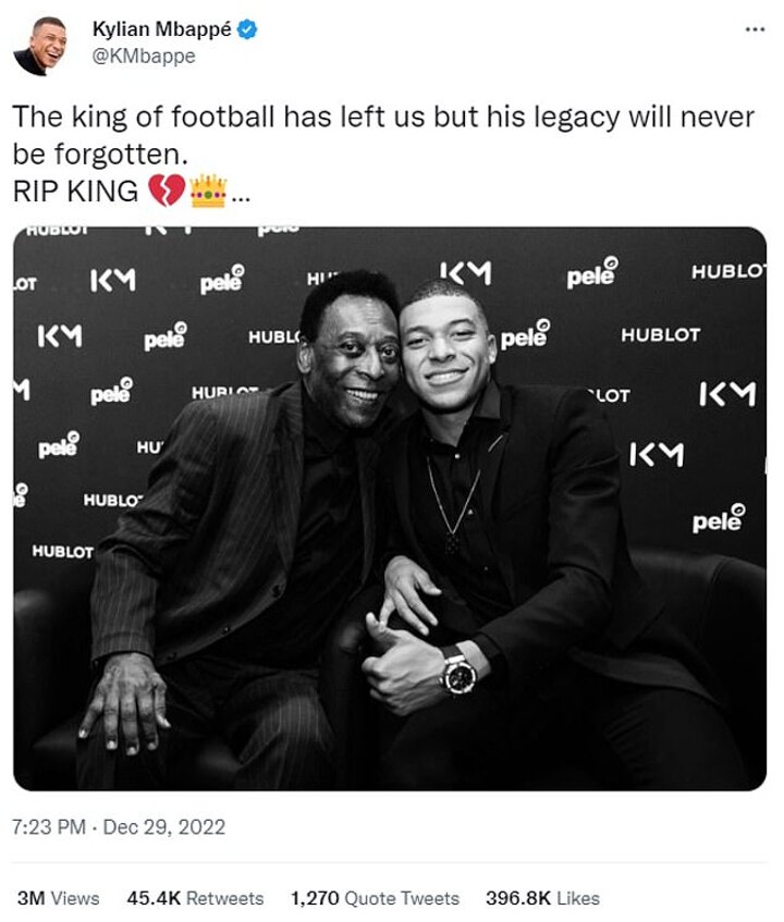 Mbappe said alongside a photo with the Brazilian: 'The king of football has left us but his legacy will never be forgotten. RIP KING.'