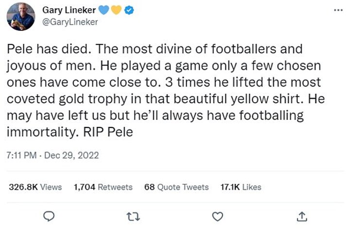 'Pele has died,' the former England international wrote. 'The most divine of footballers and joyous of men.