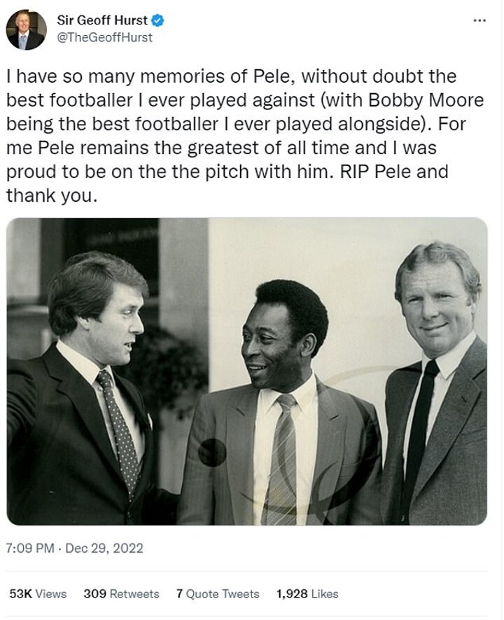 Hurst said: 'I have so many memories of Pele, without doubt the best footballer I ever played against (with Bobby Moore being the best footballer I ever played alongside). For me Pele remains the greatest of all time and I was proud to be on the the pitch with him. RIP Pele and thank you.'