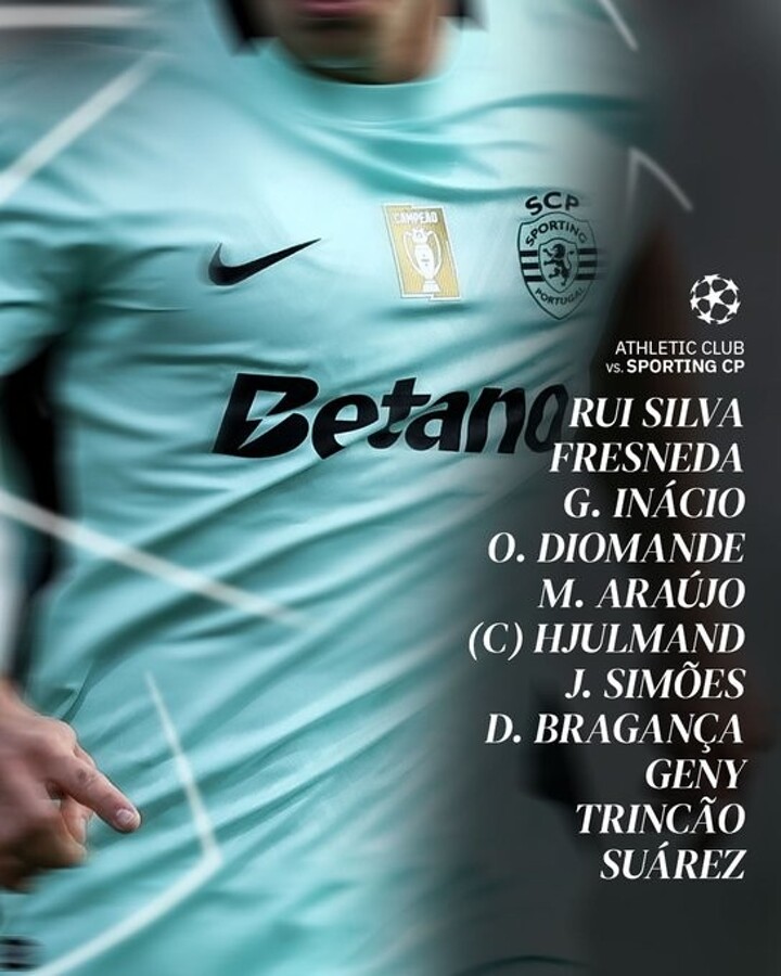 Sporting CP XI: Rui Silva, Luis Suárez, Francisco Trincão, Maxi Araújo, Morten Hjulmand, Daniel Bragança, Geny Catamo, Gonçalo Inácio, Ousmane Diomande, Iván Fresneda, João Simões