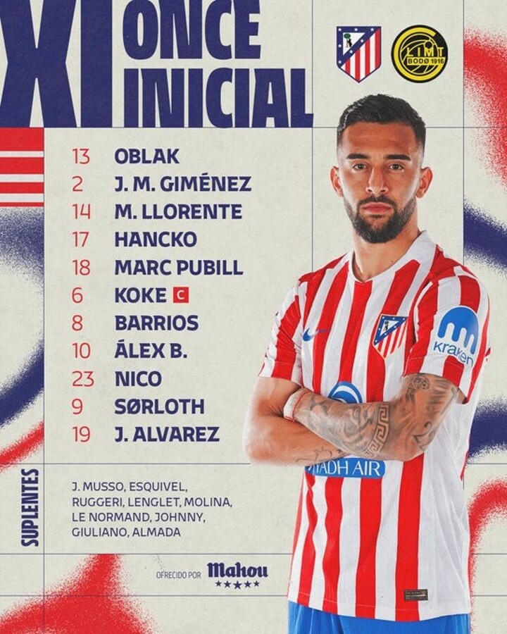 Atletico XI: Oblak, Gimenez, Llorente, Hancko, Marc Pubill, Koke(C), Barrios, Alex, Nico, Sorloth, Alvarez