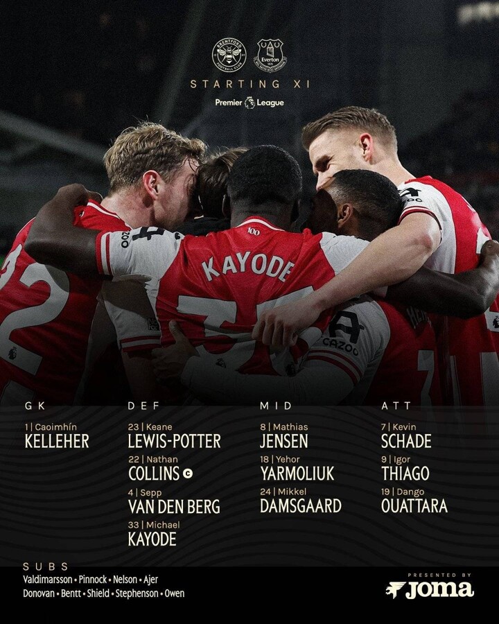 Brentford right back Kayode starts for his 50th match for the club. Everton aims to maintain the status after last week's home win against Chelsea.