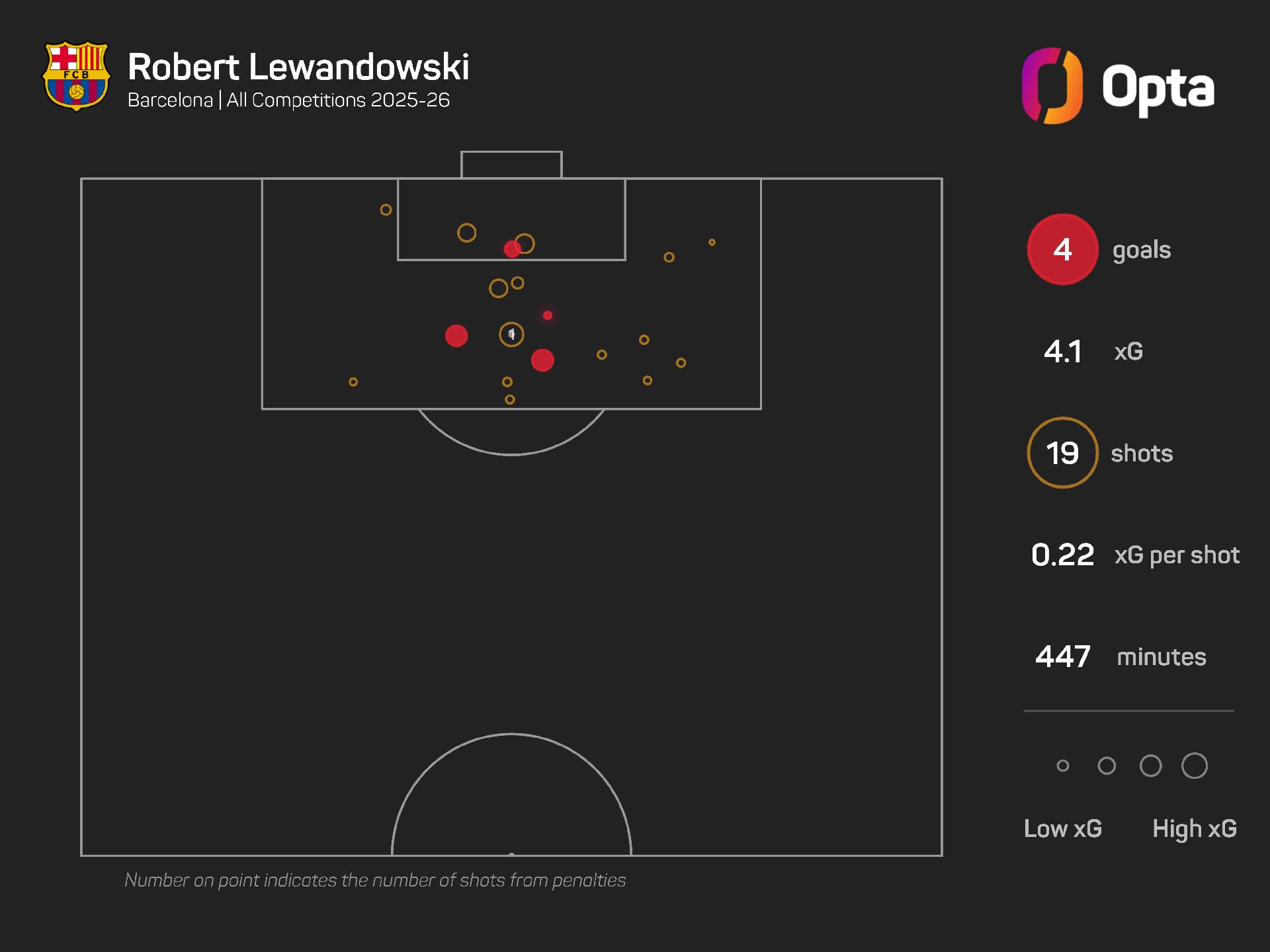 Lewandowski has scored four goals, netting every 111 minutes on average this season.