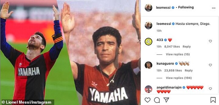 After the game, Messi posted a photo of his tribute alongside an older image of Maradona in the same shirt, adding the message "Farewell, Diego" in Spanish.