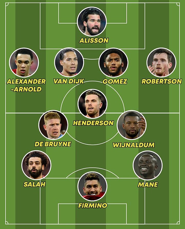 The breaking of the Liverpool stronghold is set to come from Kevin De Bruyne, who is almost certain to partner the skipper at Anfield, Jordan Henderson, in the PFA team's midfield.