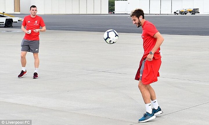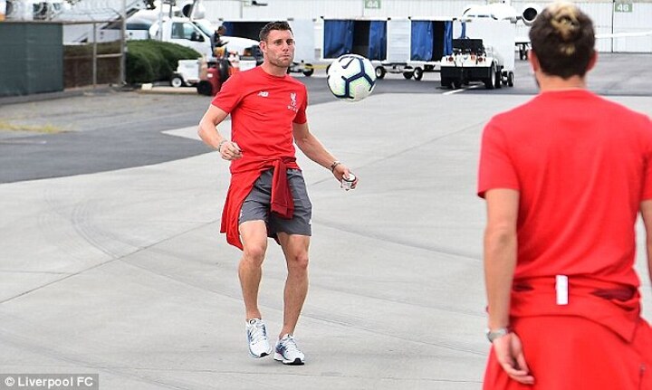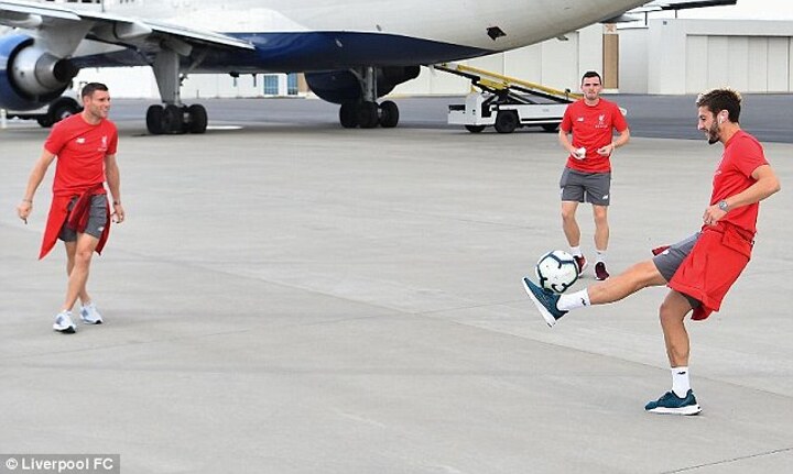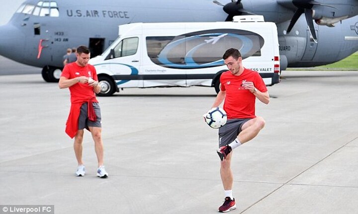Adam Lallana, James Milner and Andrew Robertson were among the players photographed having a kick about at Charlotte Douglas International Airport as they sought to pass time.