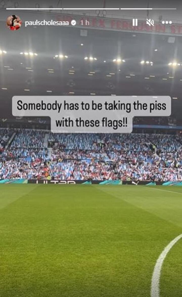 Manchester United legend Paul Scholes has hit out at Soccer Aid's decision to give attendees white and blue flags - when the game is being held at Old Trafford.