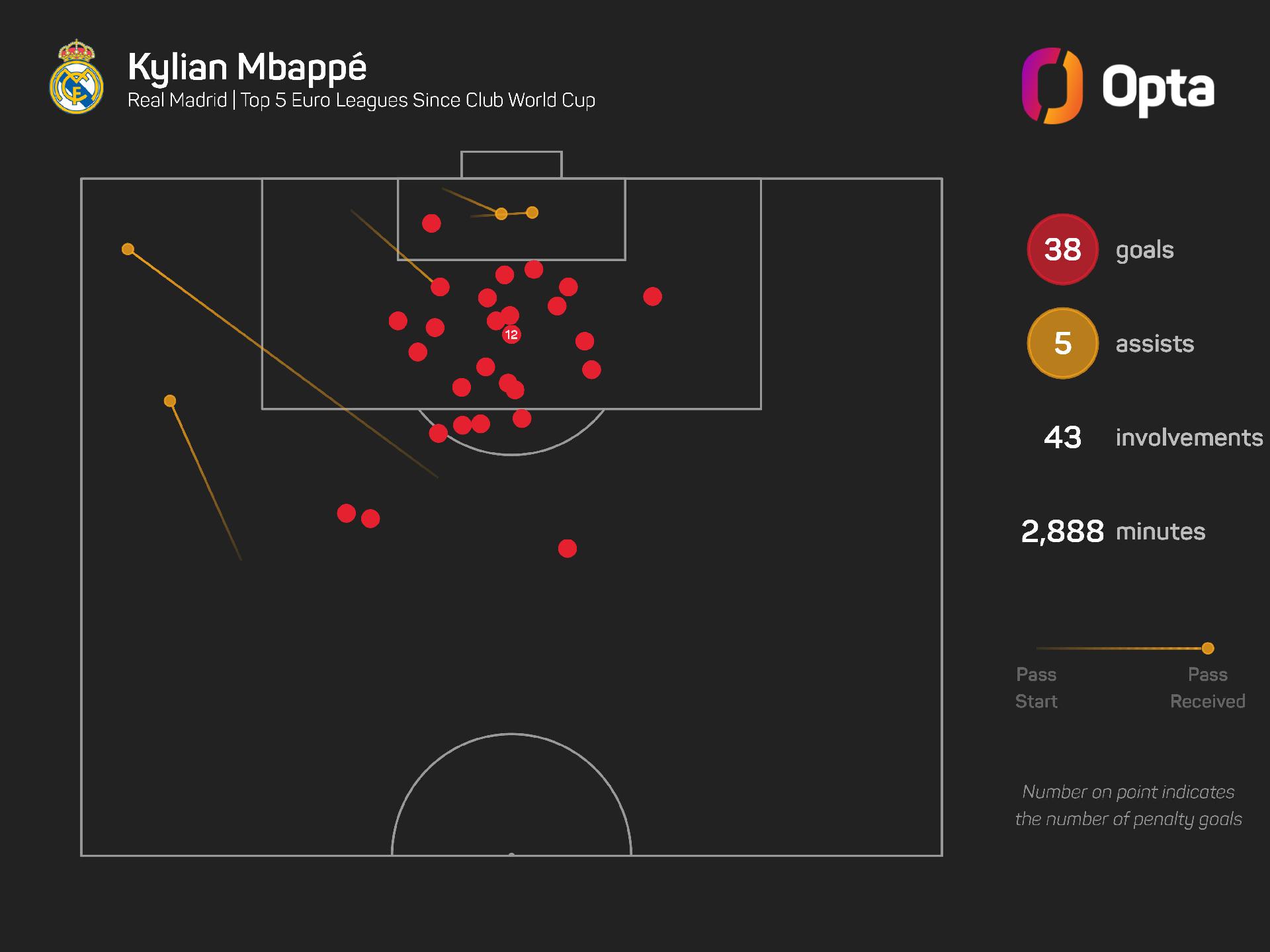 He has scored 38 goals and provided five assists in just 35 matches since the end of last year's Club World Cup, with only Harry Kane (48 goals, five assists) scoring more goals or supplying more total goal involvements in that time, among players from Europe's top five leagues.