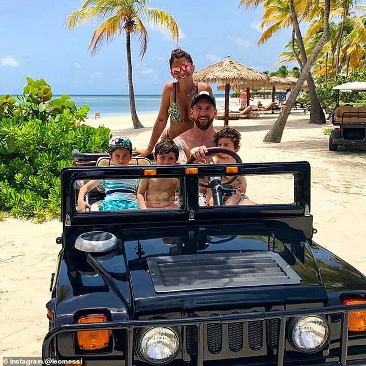 Lionel Messi rides in a Jeep with sons Thiago, Ciro and Mateo and wife Antonella Roccuzzo