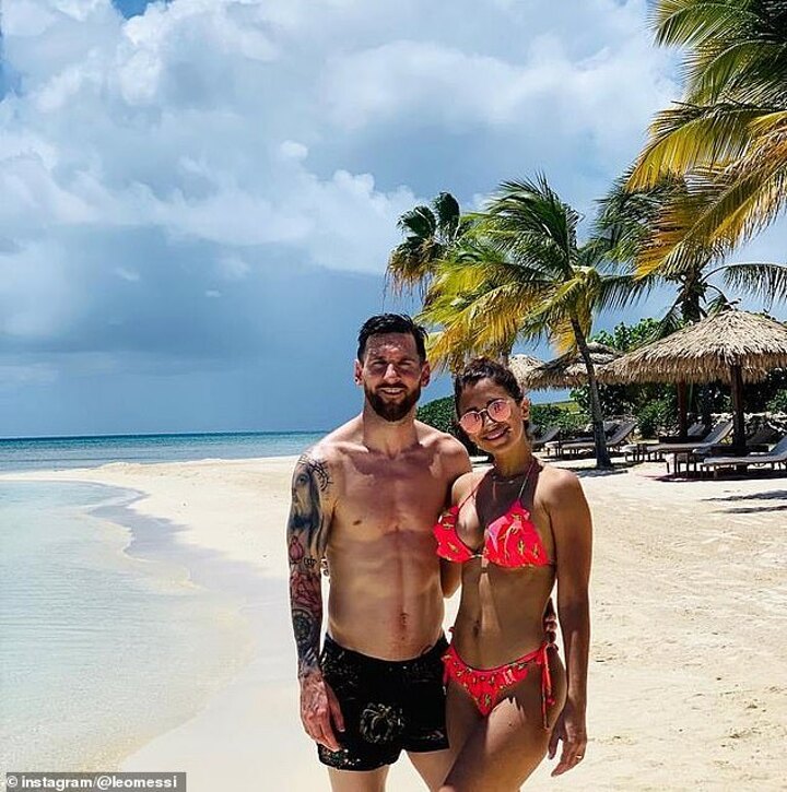 Messi poses for a photo on holiday with childhood sweetheart Antonella Roccuzzo