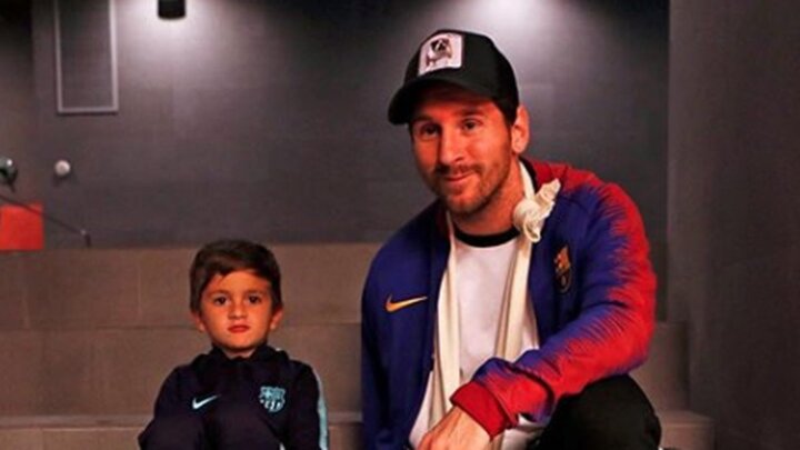 Leo Messi wasn't able to play in FC Barcelona's match against Inter Milan after breaking his arm at the weekend, but he was present at the Camp Nou to watch his team emerge victorious alongside his son Thiago.
