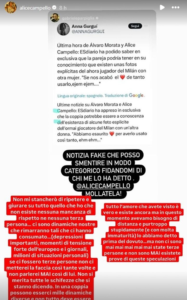 'I am tired of people saying that I was unfaithful to Alice because I didn't even go to the national team party so that this type of rumour wouldn't arise,' Morata told 'D Corazon' on La 1 via AS.