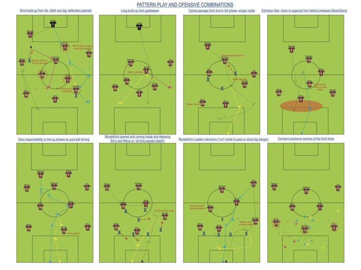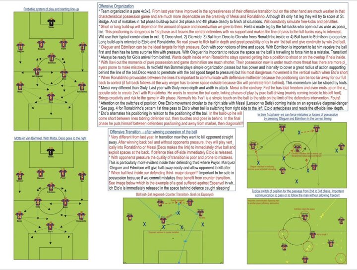 "Much more dangerous when provocating spaces inside (between lines) from those positions forces a central defender out and then with a pen. Pass releases Messi, Eto'o or the penetrating midfielder. Very poor defensive transition and defensive work -- exploit. Constant cheater -- falls easily."