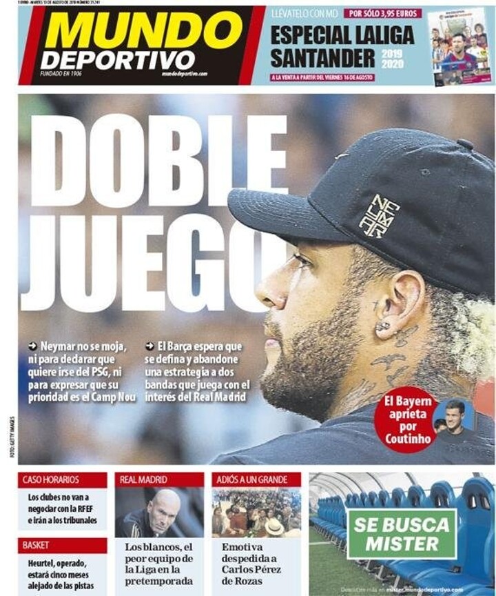 The Spanish newspaper wrote on their cover on Tuesday: "Neymar hasn't gotten himself involved, neither has he declared that he wants to leave PSG, nor expressed that his priority is the Camp Nou."