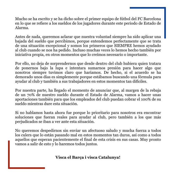 "First of all, I want to clarify that our will has always been to apply a drop in the salary we receive because we fully understand that this is an exceptional situation and we are the first ones who have ALWAYS helped the club when asked.