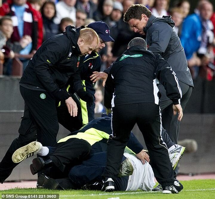 ‘My colleagues called it the fastest huckle ever,’ he recalls with a grin. ‘I jumped on the guy, breaking my pinkie, but had him up the tunnel in seconds. It was just as well because the Celtic fans were baying at him.’