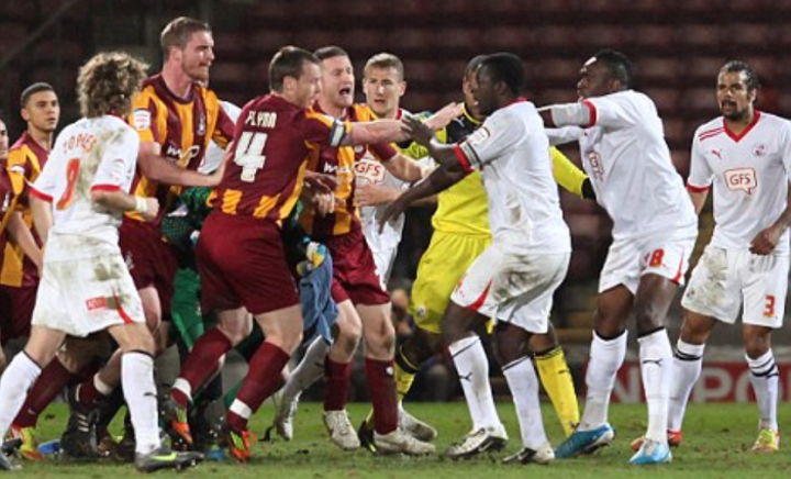 After the final whistle, Bradford defender Andrew Davies lashed out at Crawley captain Pablo Mills, prompting players from both sides to engage in a full-on brawl. Both Davies and Mills received red cards, as John McLaughlin and Luke Oliver from Bradford and Crawley's Claude Davis.