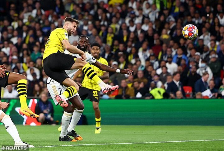 They made the first half chance of the game when Fullkrug ran on to a ball over the top of the Madrid defence, took it down well and laid it into the path of Julian Brandt. Brandt advanced on goal but was put off by a nudge in the back and shot wide.