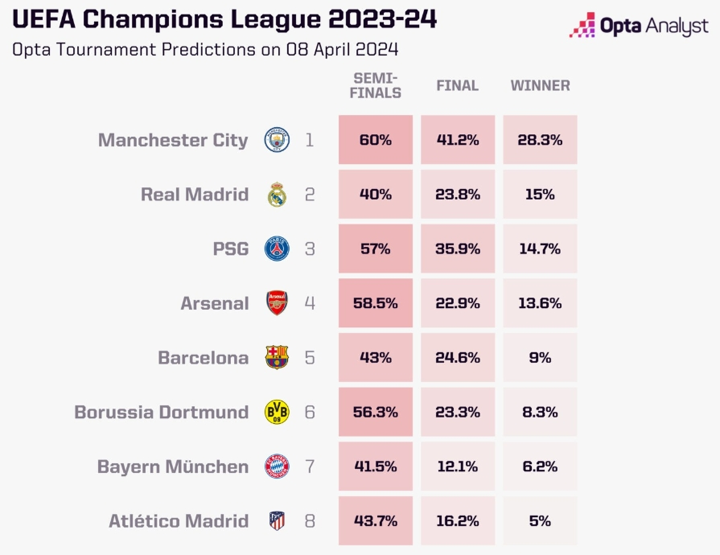 Pep Guardiola's men have been backed by the data to retain their title, but it will not be easy. They are thought to have a 60% chance of making the semi-finals and beating Real Madrid, with a 41.2% chance of making it all the way to Wembley.