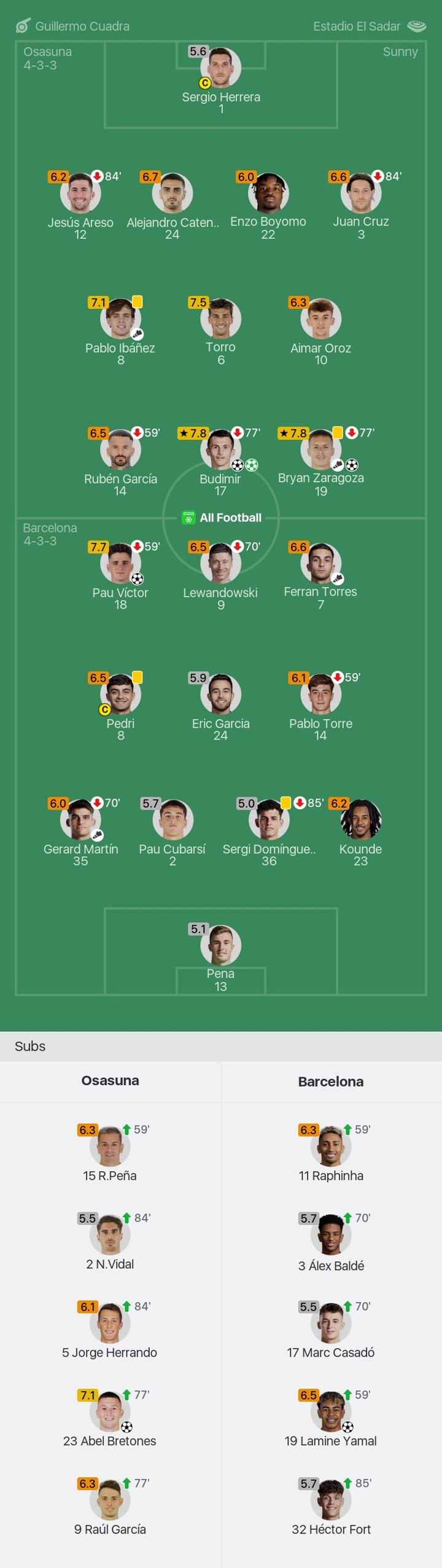 We bring you the player ratings for Osasuna vs Barcelona as Budimir becomes Man of the Match with a rating of 7.8.