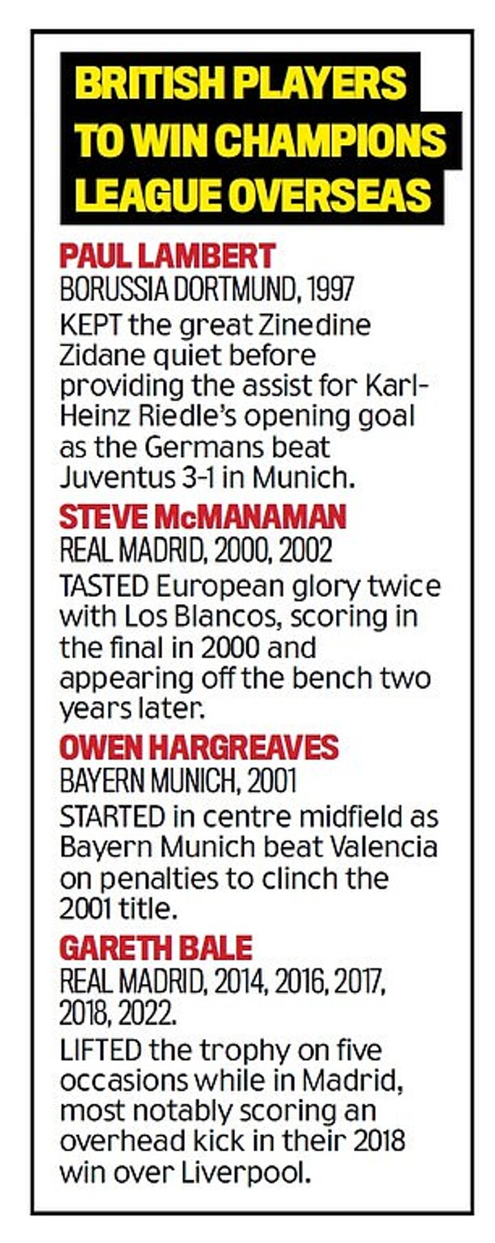 That brilliant kid has since become that superstar and, on Saturday at Wembley in the colours of Real Madrid, he will aim to join Lambert and a unique band of Brits — Steve McManaman, Owen Hargreaves and Gareth Bale — who’ve won the Champions League with foreign clubs. Oh, and it’s Borussia Dortmund in opposition.