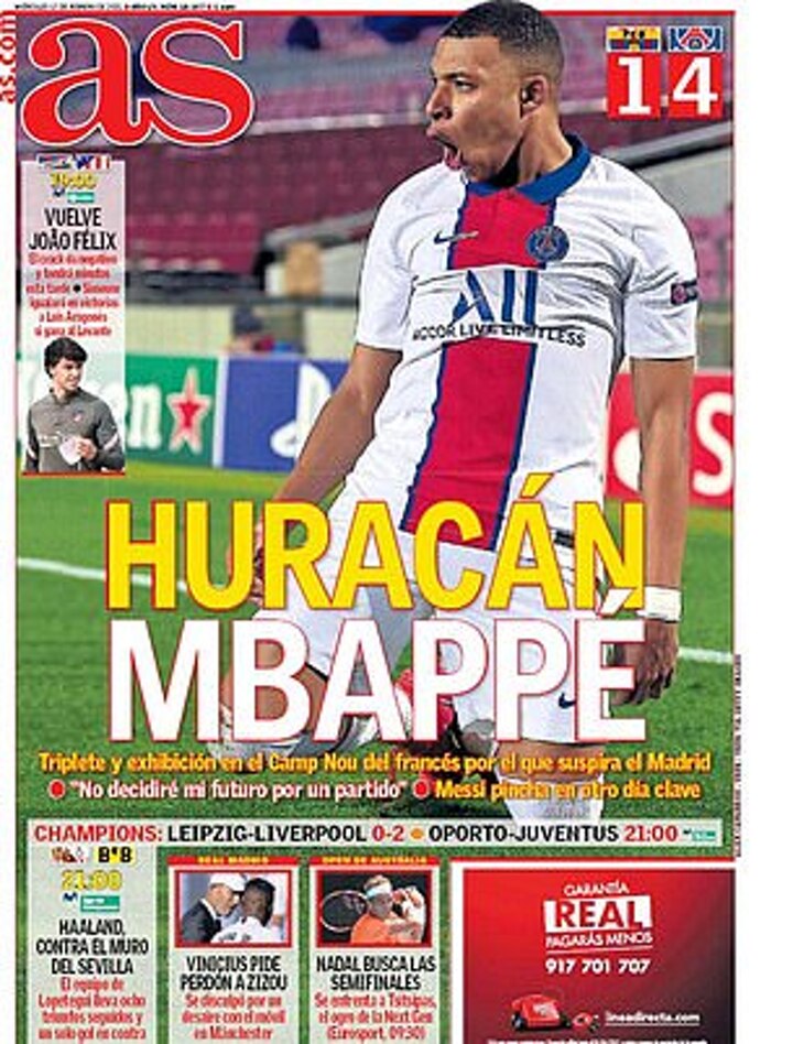 It was Mbappe who dominated Wednesday's front pages with his performance described by Diario AS as like 'a hurricane' that devastated the Nou Camp.