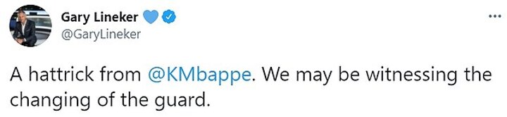 'A hat-trick for @KMbappe tonight,' Lineker wrote. 'We may be witnessing a changing of the guard.'
