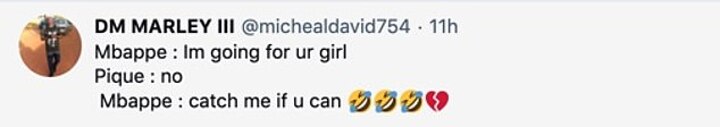 The jokes continued long after the match with one amused fan writing: 'Mbappe: I'm going for your girl; Pique: no; Mbappe: catch me if you can'.