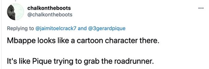 Another added: 'Mbappe looks like a cartoon character there. It's like Pique trying to grab the roadrunner.'