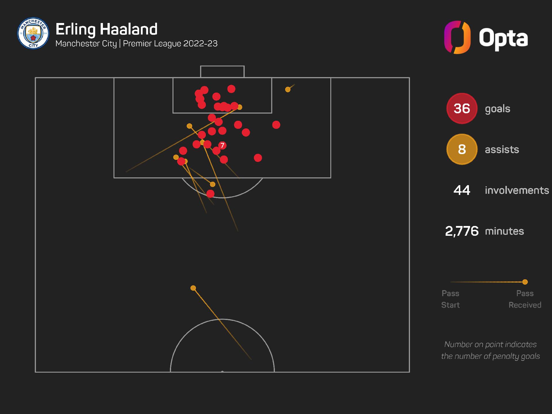 He is also level with Chelsea great Didier Drogba in the all-time Premier League goal charts, with Drogba needing 252 matches, 149 more than Haaland, to score 104 times.