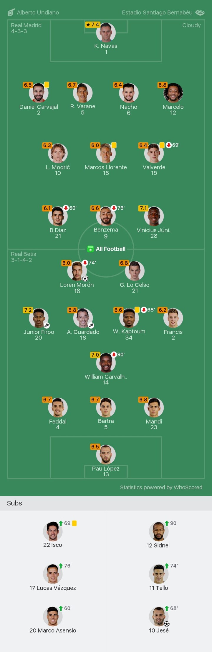 We bring you the player ratings for Real Madrid vs Real Betis as K. Navas becomes Man of the Match with a rating of 7.4.
