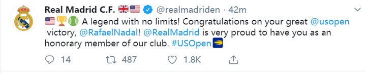 A longtime Real Madrid supporter, Rafeal Nadal just won his 19th Grand Slam title in today's US Open final. Real Madrid post their congratulations to the tennis legend.