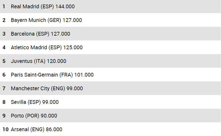 That's according to the UEFA rankings, as the three-in-a-row Champions League winners end the year with 144 points.