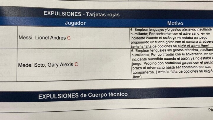 In the referee report after the match, the Paraguayan wrote down his reasons for showing red cards to Messi and Medel: